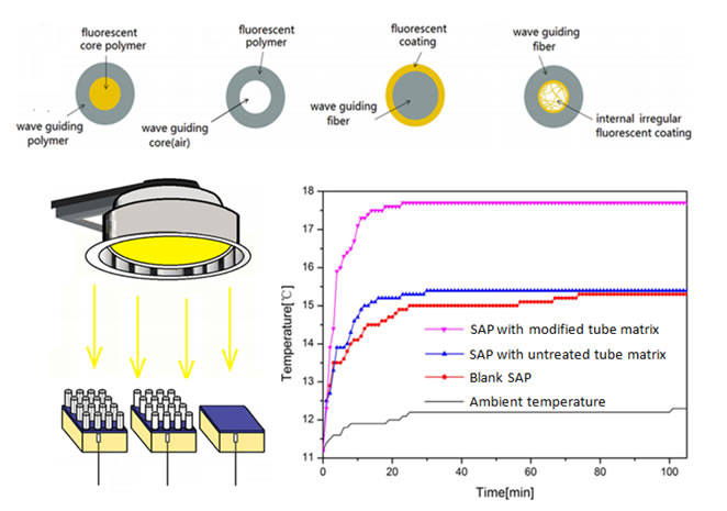 In this paper, a new bionic photo-thermal conversion waveguide fiber structure with fluorescent dyestuff is designed based on earlier research of bionic models and the core part of waveguide fiber is closer to the real polar bear hairs after irregular internal coating. By selecting the appropriate adhesive solution and optimizing the concentration of different fluorescent dyestuff materials, a more stable structure of inner-coating fiber model with a relatively high reflectance in the IR and a comparatively high thermal energy release function was obtained. For the coating dyestuffs, coumarin 1 has a higher Stokes shift comparing with coumarin 6, which enhance the photo-thermal conversion efficiency of this innovative fiber model with coumarin 1.